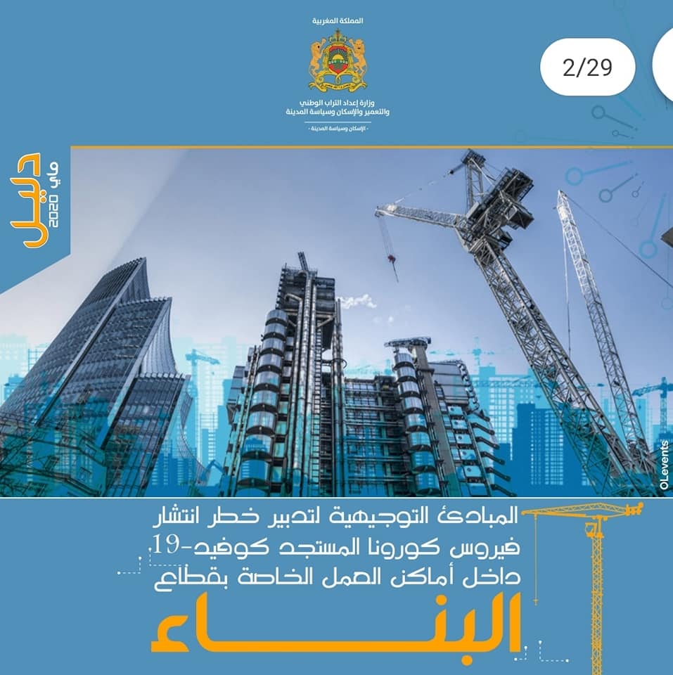 ... وزارة إعداد التراب الوطني والتعمير والإسكان وسياسة المدينة تصدر دليلا متعلقا بتدبير مخاطر انتشار" كوفيد-19" في أماكن العمل بقطاع السكن والبناء :
