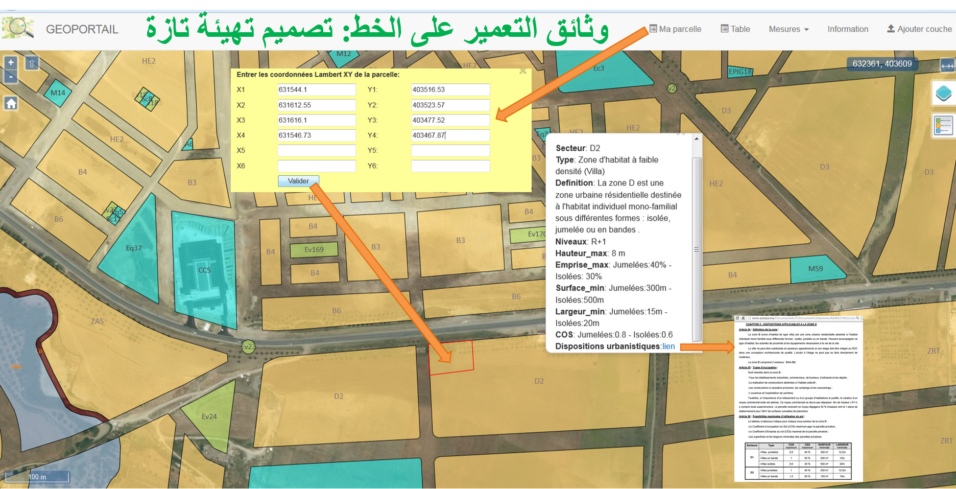 Il est à signaler que, la plateforme applicative, développée par les moyens propres de l’AUT, permet de consulter les renseignements urbanistiques applicables aux zones couvertes par des documents d’urbanisme homologués en complète interaction avec l’utilisateur. Ainsi ce dernier peut afficher les informations d’un secteur donné, d’un équipement ou d’un espace vert, existant ou projeté, par un simple clic sur ce dernier. En plus l’utilisateur disposant des coordonnées Lambert d’une parcelle a la possibilité de la localiser sur le plan en faisant appel à la fonctionnalité « ma parcelle » de l’application.