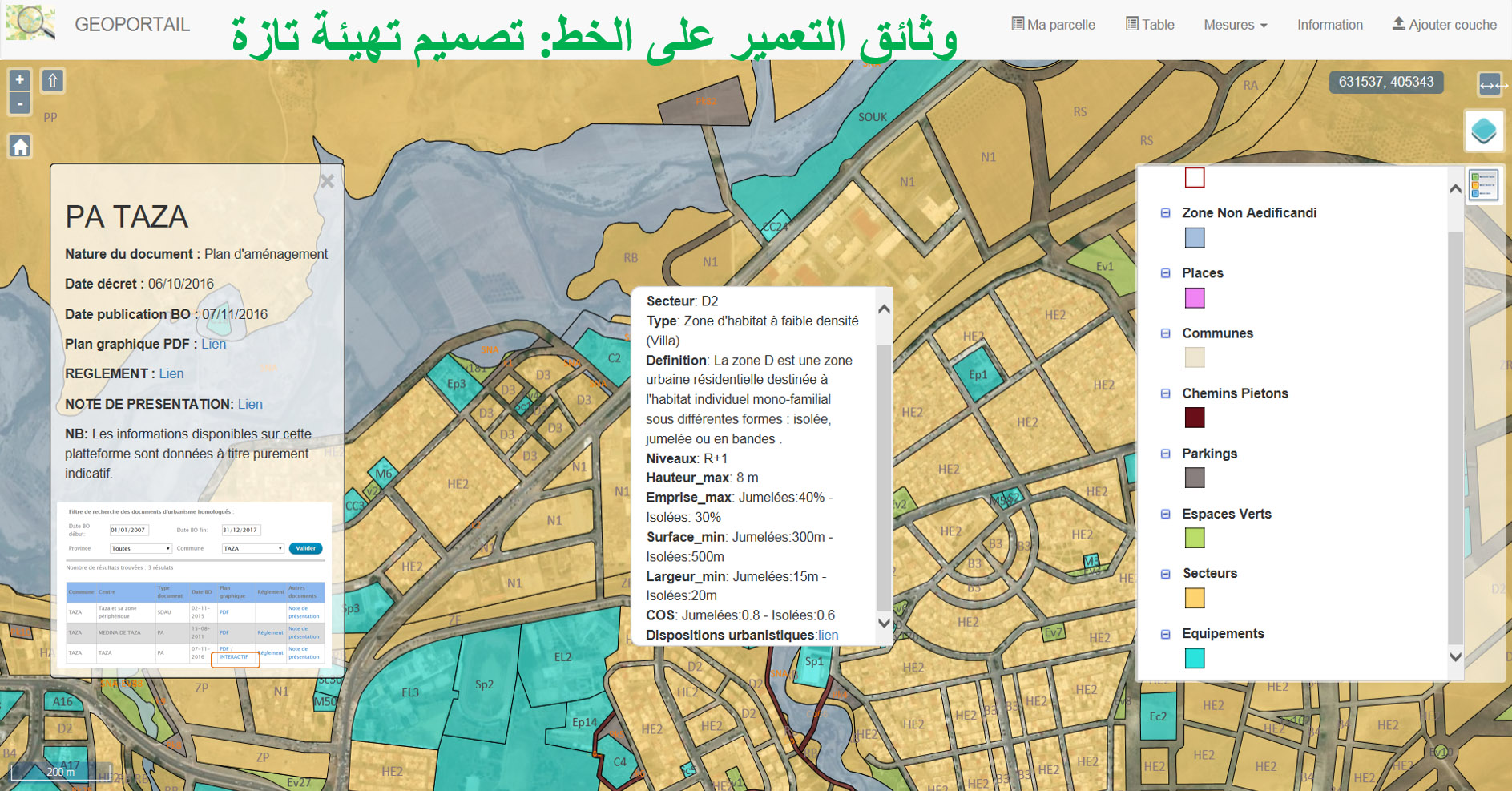 Jusqu’à présent les plans d’aménagement d’Oued Amlil , de Karia Ba Mohammed, d’Ain Madiouna, de Sidi Yahya Bni zeroual, de Zrarda et de Taza sont déjà opérationnels en mode dynamique et intéractif sur le géoportail de l’AUT via les liens suivant : PA OUED AMLIL /PA KARIA BA MOHAMMED / PA AIN MADIOUNA / SIDI YAHYA BNI ZEROUAL / ZRARDA / PA TAZA